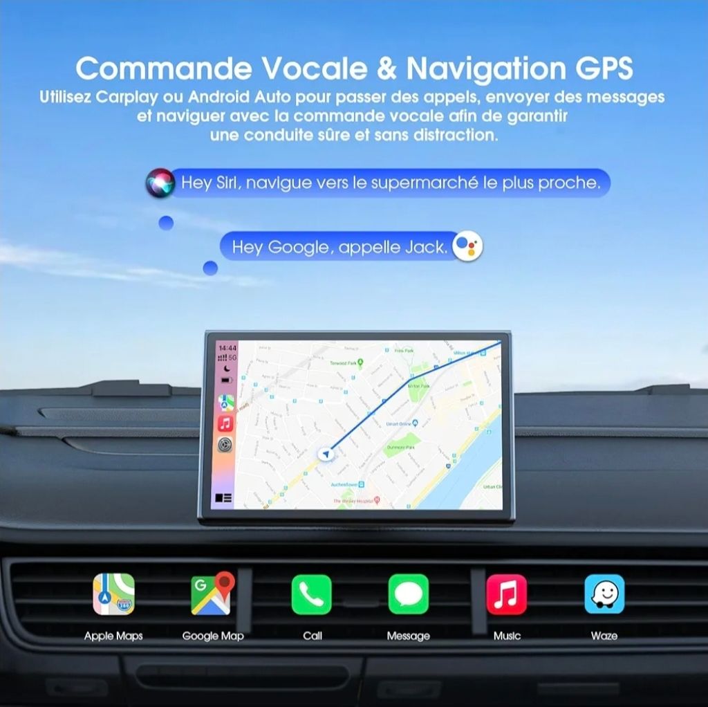 Contrôle vocal intelligent : utilisez Siri ou Google Assistant pour une conduite mains libres sécurisée. Navigation en temps réel avec Apple Maps, Google Maps ou Waze.