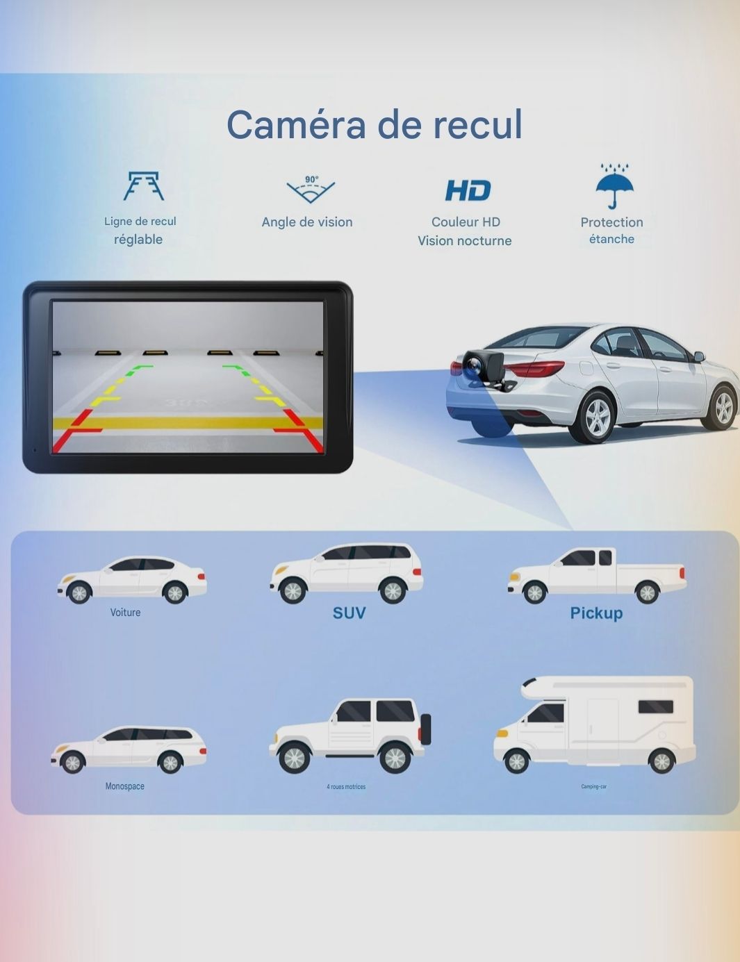 Caméra de recul HD 1080p incluse : vision claire avec lignes d’assistance au stationnement. Étanche IP65, idéale même sous la pluie.